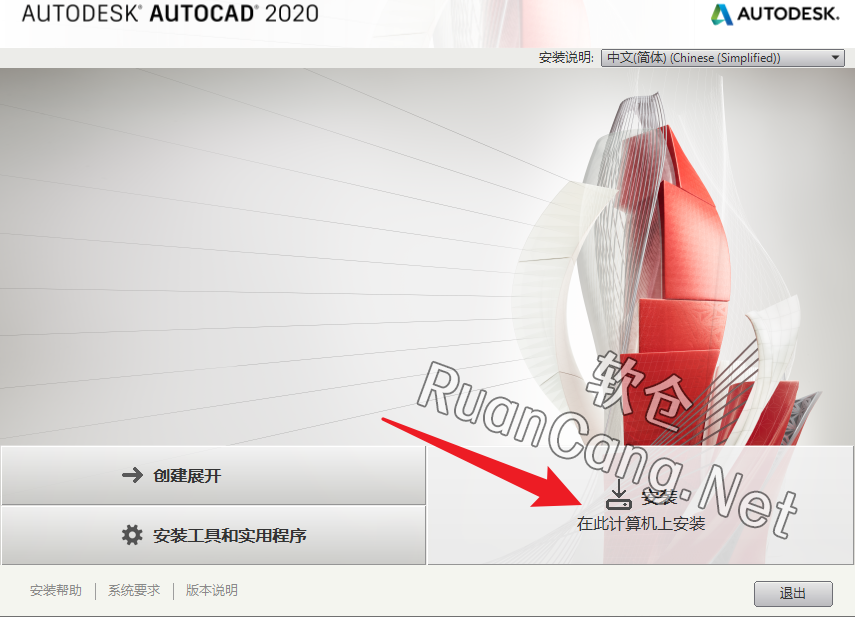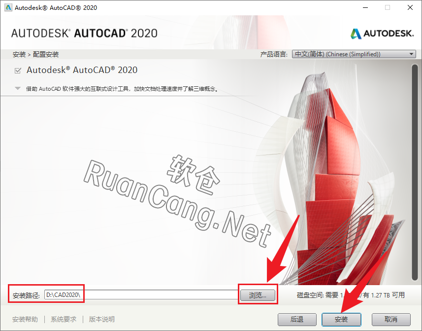 6.点击【浏览】可更改安装位置(建议不要安装在C盘,可以在D盘或其它磁盘下新建一个“CAD2020”文件夹。注:安装路径中不能有中文),点击【安装】。