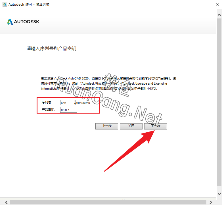 13.输入序列号【666-69696969】,输入产品密钥【001L1】,点击【下一步】。