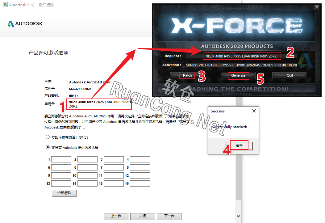 19.生成激活码:①使用快捷键“Ctrl+C”复制【申请号】后的代码;②使用快捷键“Ctrl+V”将代码粘贴到【Request】后的框中;③点击【Patch】;④点击【确定】;⑤点击【Generate】生成激活码。