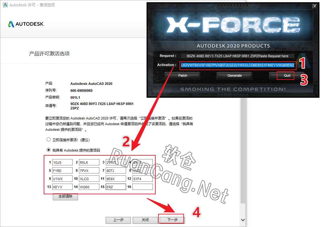 20.输入激活码:①使用快捷键“Ctrl+C”复制【Activation】后框中的激活码;②使用快捷键“Ctrl+V”将激活码粘贴到【激活码输入框】中;③点击【Quit】;④点击【下一步】。