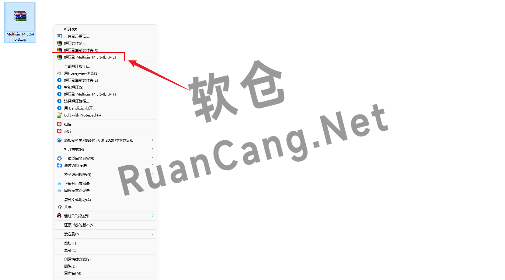 1.鼠标右击【Multisim 14.3(64bit)】压缩包(win11系统需先点击“显示更多选项”)选择【解压到 Multisim 14.3(64bit)】。