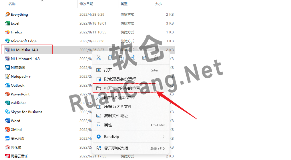 21.鼠标右击【NI Multisim 14.3】选择【打开文件所在的位置】。