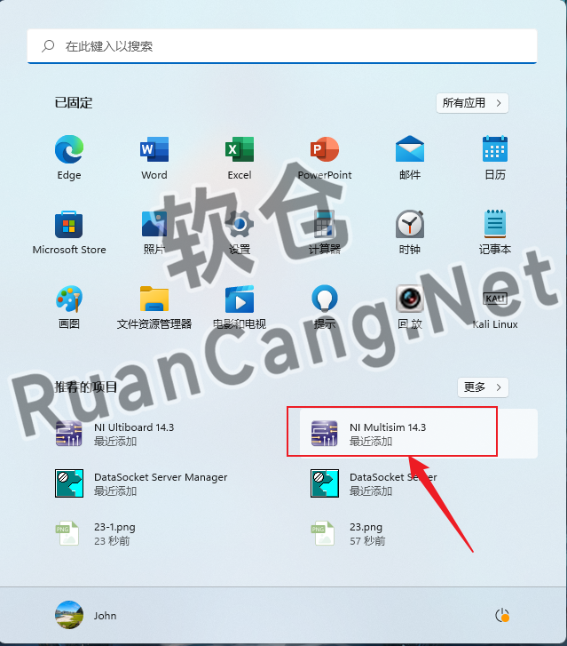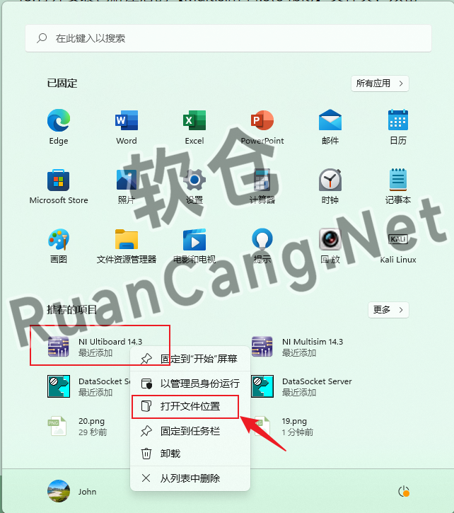 20.点击桌面任务栏中的【开始图标】,鼠标右击【NI Multisim 14.3】(可在所用应用或最近添加中找到)选择【打开文件位置】。