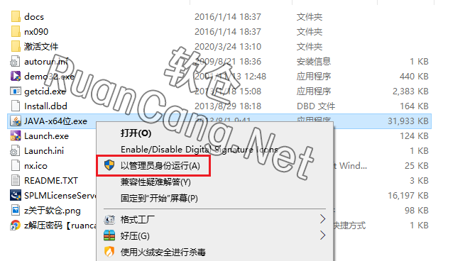 2.鼠标右击【JAVA-x64位】选择【以管理员身份运行】。
