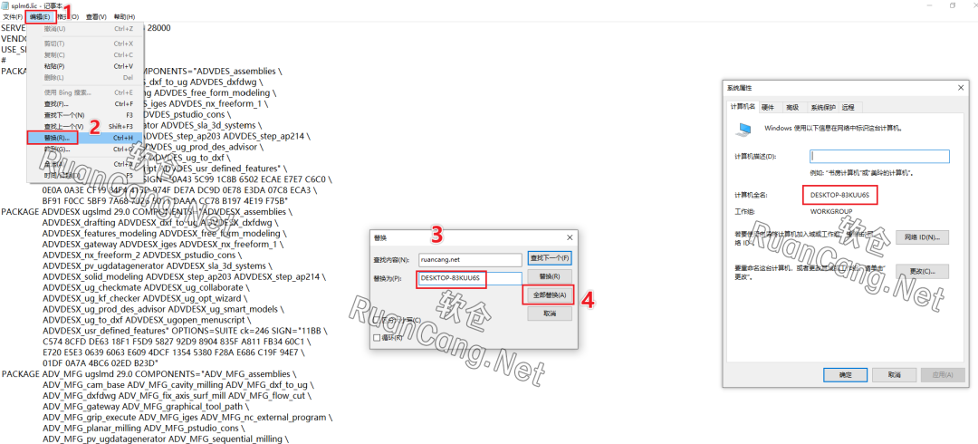 8.点击【编辑】选择【替换】,输入查找内容【ruancang.net】,在【替换为】处输入自己的“计算机全名”,点击【全部替换】。