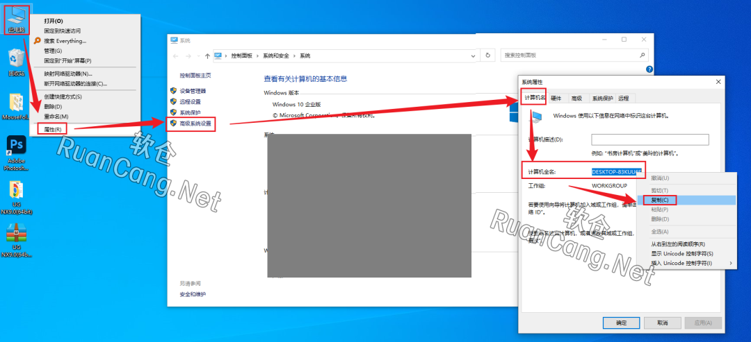 计算机全名查看方法:鼠标右击桌面【此电脑】选择【属性】,点击【高级系统设置】,点击【计算机名】(不推荐手动输入,可全选计算机全名进行复制)。