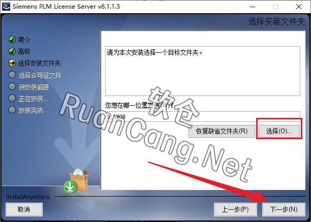 14.点击【选择】可更改安装位置(建议不要安装在C盘,可以在D盘或其它磁盘下新建一个“UG9”文件夹,注:安装路径中不要有中文),点击【下一步】。