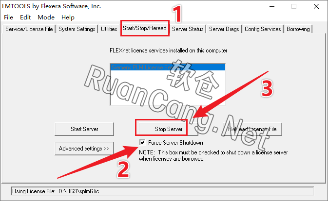 41.点击【Start/Stop/Reread】,勾选【Force Server Shutdown】,【点击【Stop Server】。