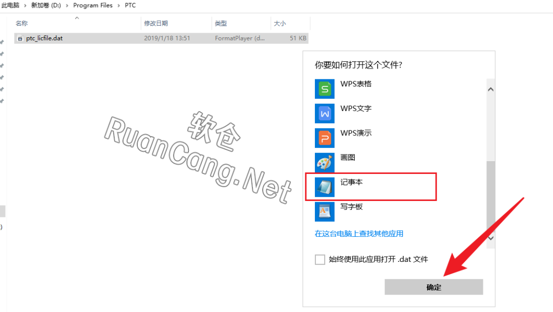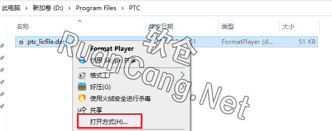 5.双击依次展开粘贴后的文件夹路径(D:Program FilesPTC),鼠标右击【ptc_licfile.dat】选择【打开方式】。