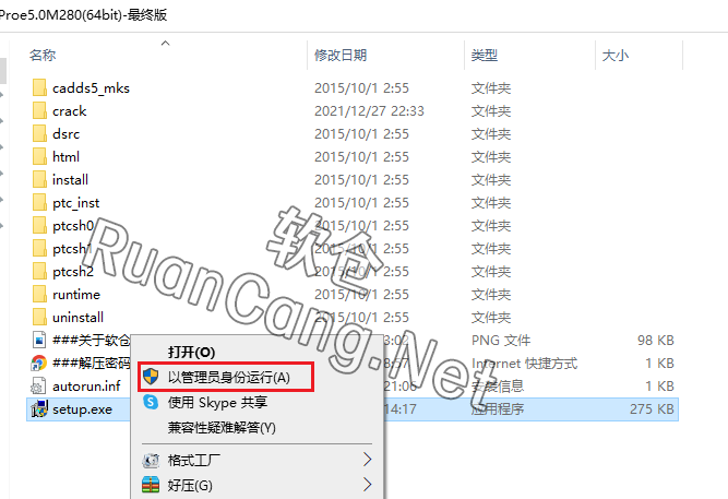 7.打开安装包解压后的【Proe5.0M280(64bit)】文件夹,鼠标右击【setup】选择【以管理员身份运行】。