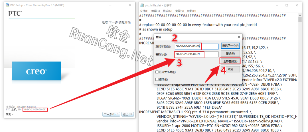 8.回到记事本界面,①在键盘上按【ctrl+h】键,②输入查找内容【00-00-00-00-00-00】③输入替换内容【PTC主机ID】(步骤7打开后的界面所显示的PTC主机ID,这里的“PTC主机ID”每台电脑都不同,请以安装电脑显示的ID为准)④点击【全部替换】(替换完成后保存Ctrl+S)