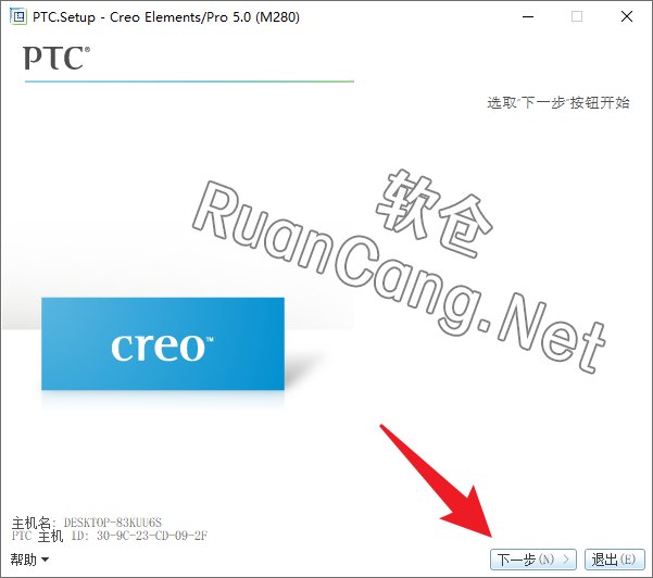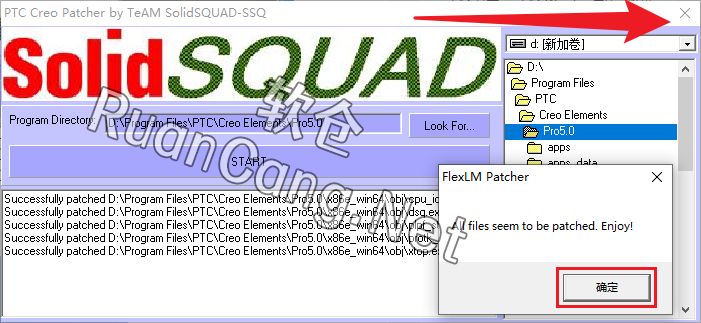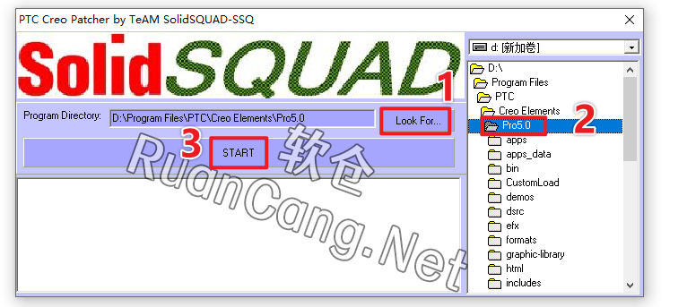 25.①点击【Look For……】②选择【D:Program FilesPTCCreo ElementsPro5.0】(步骤12的设置的安装位置)③点击【Start】。