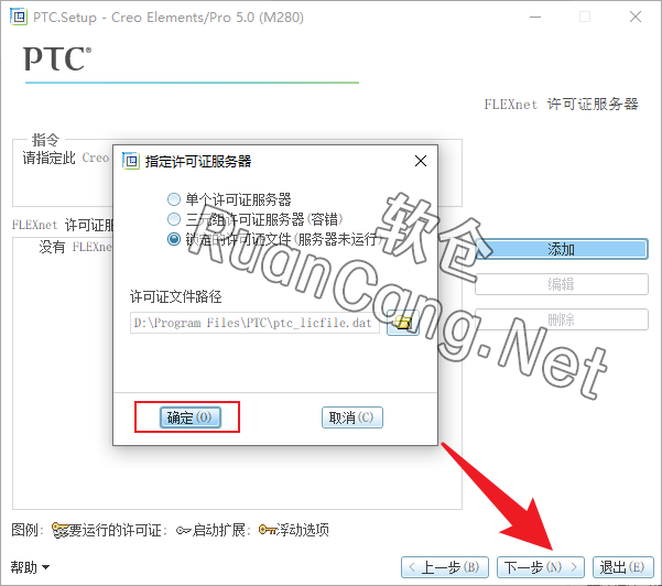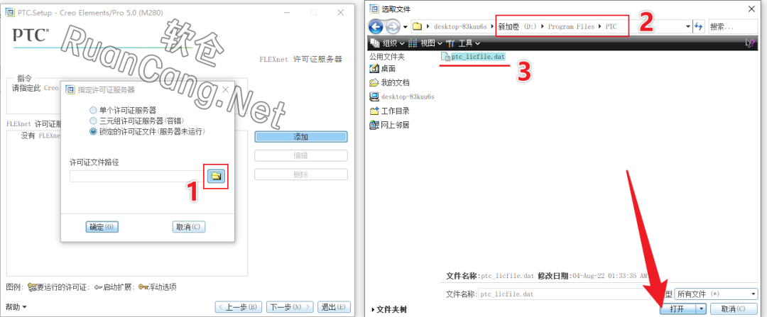 15.①点击【文件夹图标】②选择【ptc_licfile.dat】文件(步骤4复制的文件夹路径下:D:Program FilesPTC)③点击【打开】。