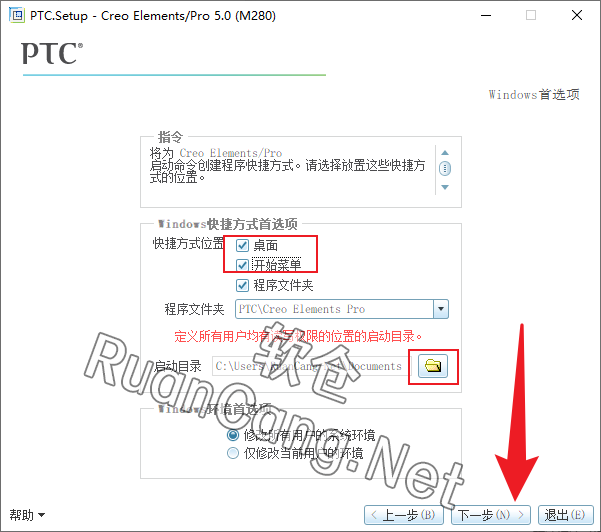 17.勾选【桌面、开始菜单、程序文件夹】,点击启动目录后方【文件夹图标】可更改启动目录路径(我这里保持默认),点击【下一步】。