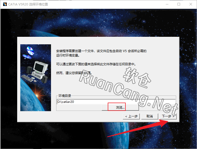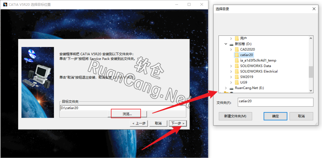 6.点击【下一步】(可点击“浏览"更改为步骤5在D盘新建的catiar20文件夹】。