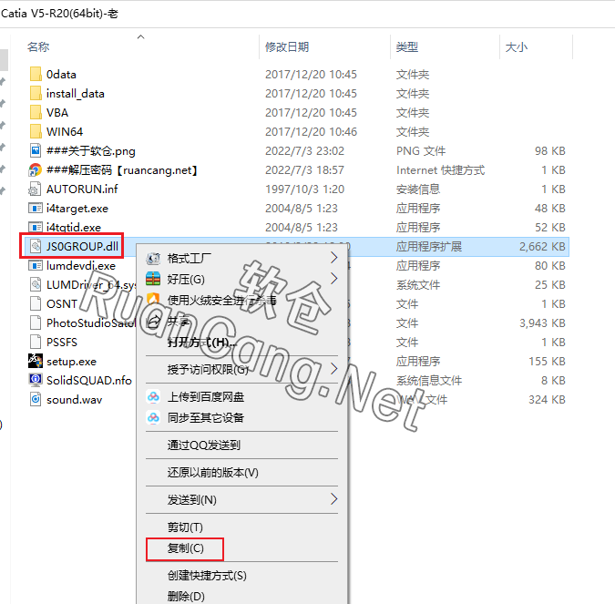 16.打开解压后的【CatiaV5-6R20(64bit)】文件,鼠标右击【JS0GROUP.dll】选择【复制】。