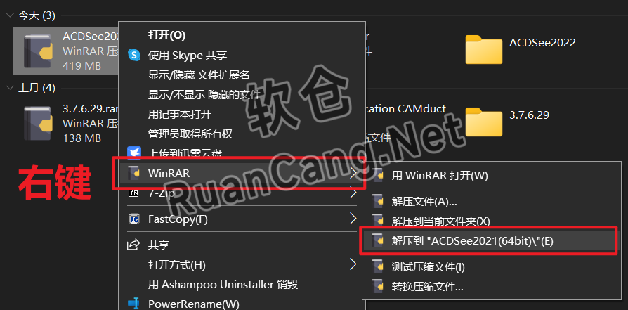 ☉1.鼠标右击【ACDSee2021(64bit)】压缩包选择【解压到 ACDSee2021(64bit)】。