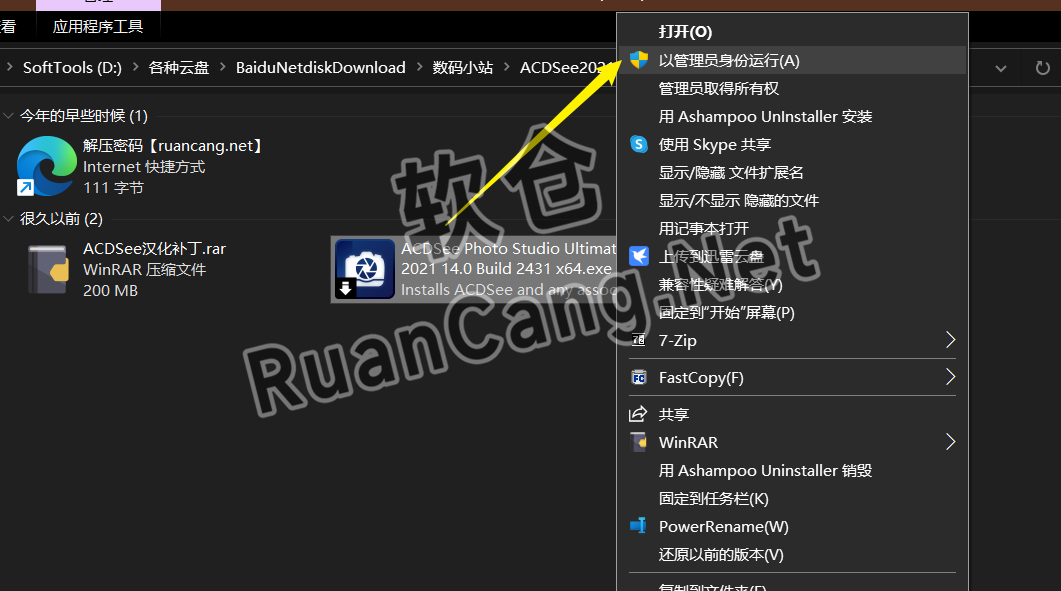 ☉2.打开解压后的文件夹,鼠标右击【ACDSee Photo Studio Ultimate 2021 14.0 Build 2431 x64】选择【以管理员身份运行】。