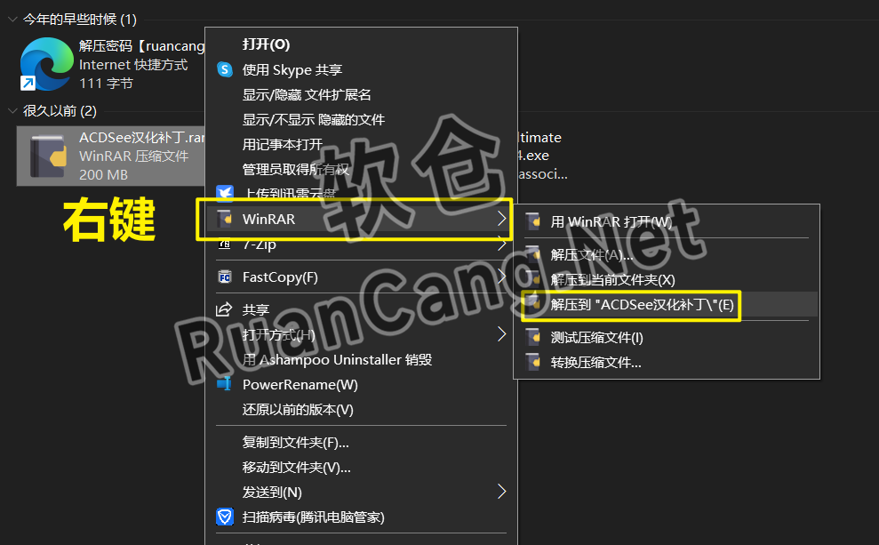 ☉12.打开安装包解压后的【ACDSee2021(64bit)】文件夹,鼠标右击【ACDSee汉化补丁】选择【解压到 ACDSee汉化补丁】。