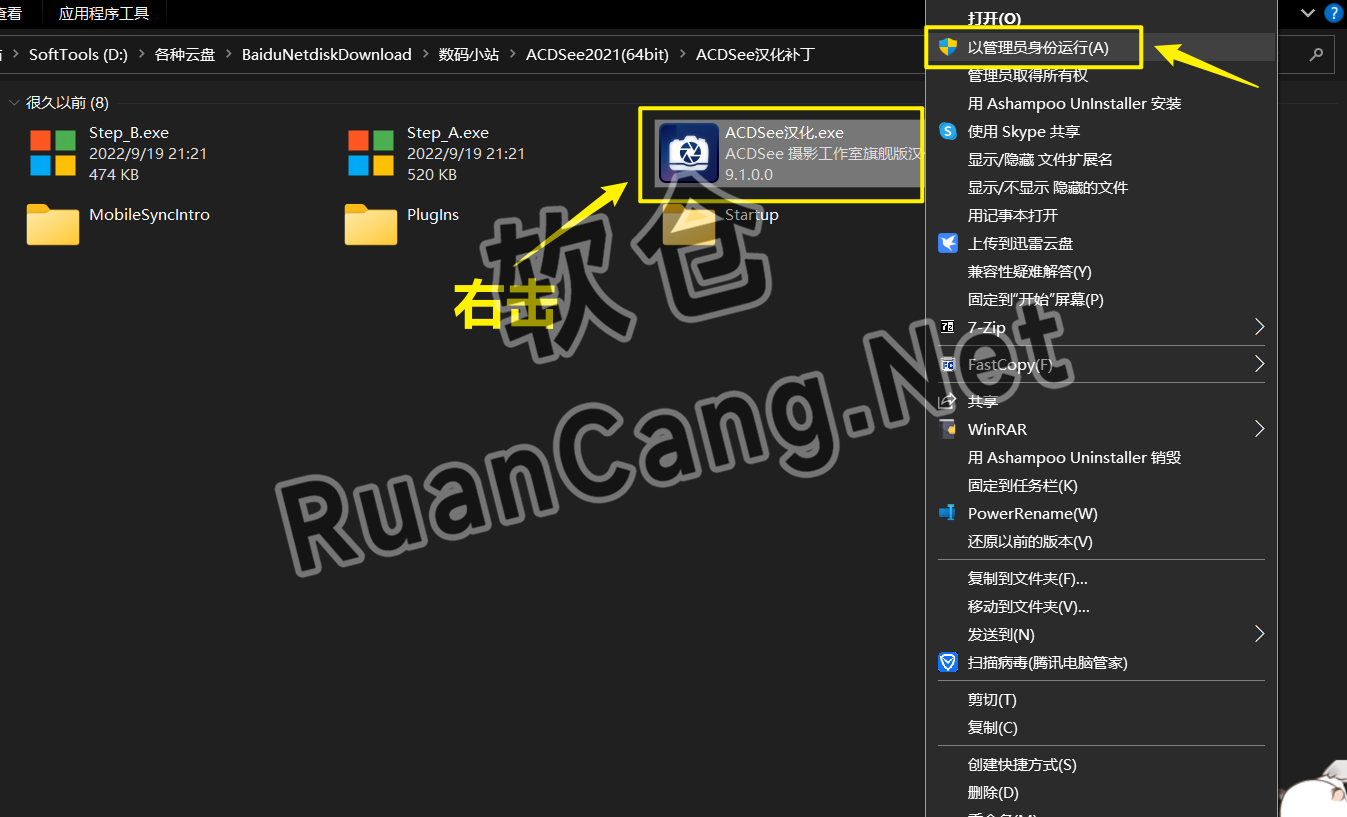 ☉13.打开解压后的【ACDSee汉化补丁】文件夹,鼠标右击【ACDSee汉化】选择【以管理员身份运行】。
