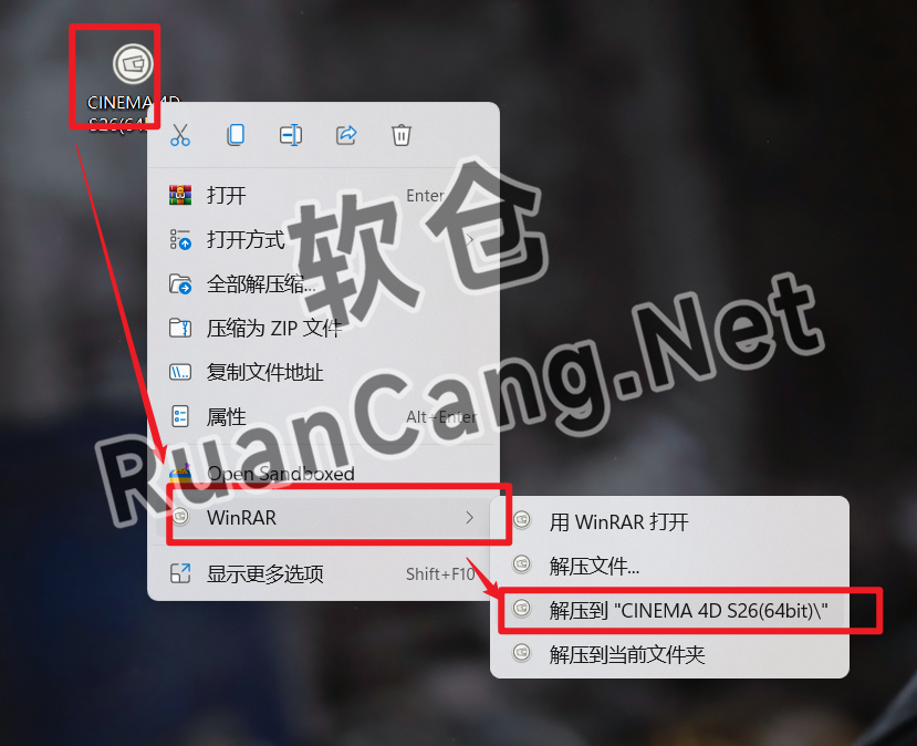 1.鼠标右击【C4D S26(64bit)】压缩包(win11系统需先点击“显示更多选项”)选择【解压到 C4D S26(64bit)】。