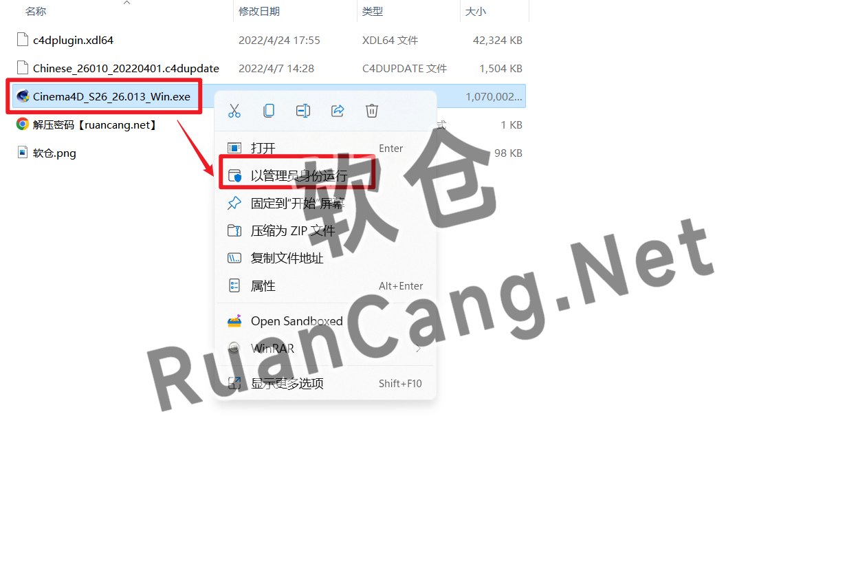 3.鼠标右击【Cinema4D_S26_26.013_Win】选择【以管理员身份运行】。