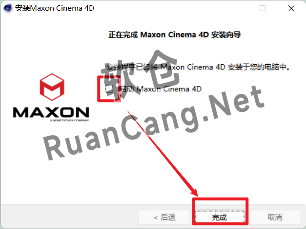 8.取消勾选【启动 Maxon ……】,点击【完成】。