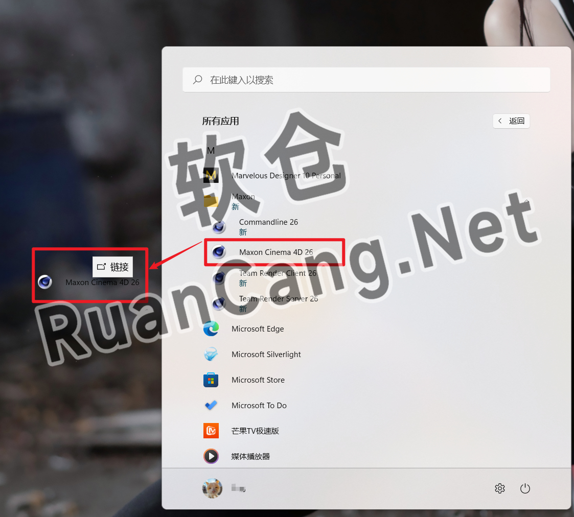 9.创建桌面启动快捷方式:点击Windows开始菜单,找到并将【Maxon Cinema4D_S26】拖动到桌面。