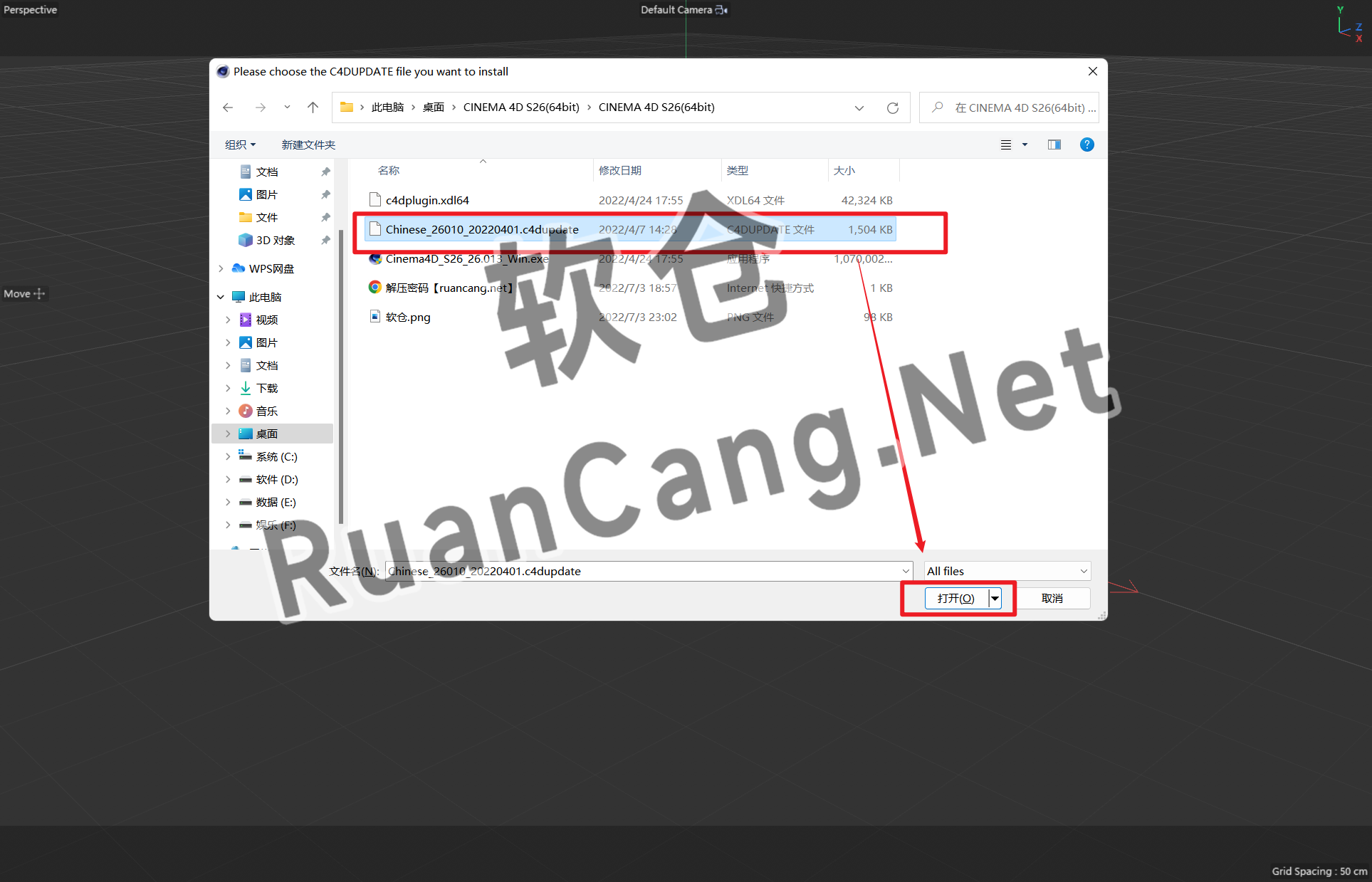 18.选择安装包解压后的【C4D S26(64bit)】文件夹中的【Chinese_26010_20220401.c4dupdate】,点击【打开】。
