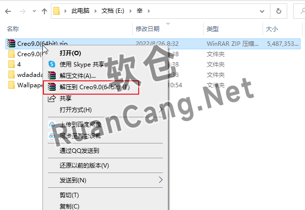 1.鼠标右击【Creo9.0(64bit)】压缩包(win11系统需先点击“显示更多选项”)选择【解压到 Creo9.0(64bit)】。