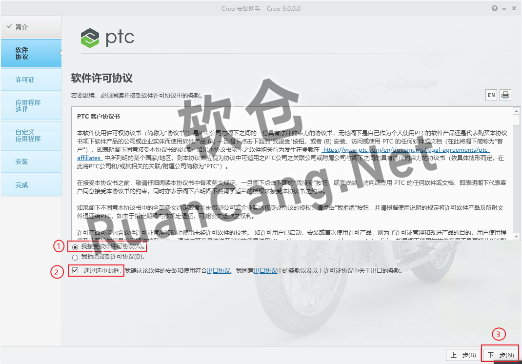 4.选择【我接受软件许可协议】,勾选【通过选中此框……】,点击【下一步】。
