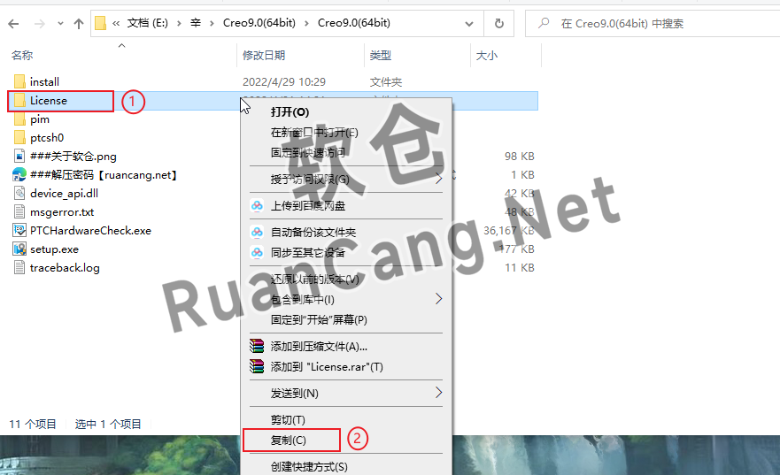 6.打开安装包解压后的【Creo9.0(64bit)】文件夹,鼠标右击【License】文件夹选择【复制】。