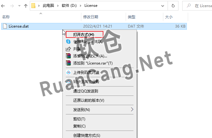 8.打开粘贴后的【License】文件夹,鼠标右击该文件夹下的【License.dat】选择【打开方式】。