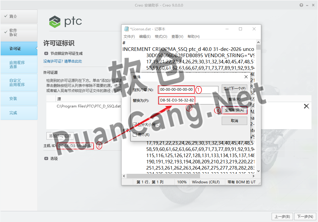 10.在键盘上按下【Ctrl】+【H】键,①在查找内容处输入【00-00-00-00-00-00】②回到步骤5所在界面,将主机ID后的代码复制到“替换为”后的输入框中③点击【全部替换】。