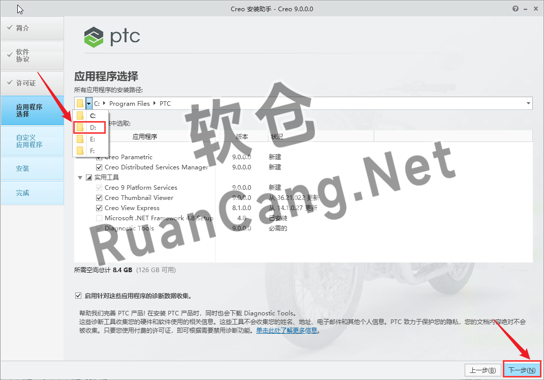 14.点击【展开符】选择需要将软件安装的磁盘位置(如:D盘),点击【下一步】。